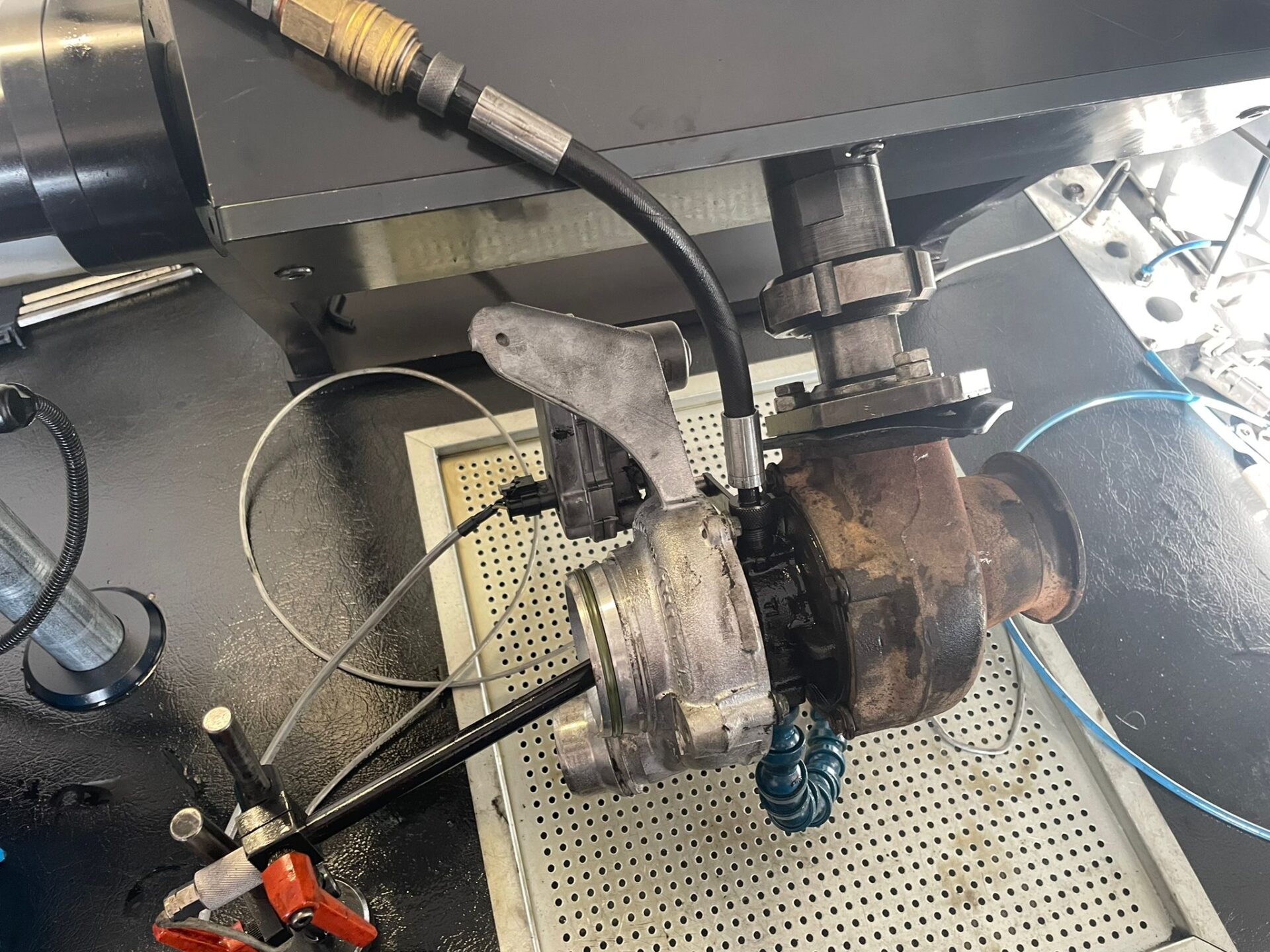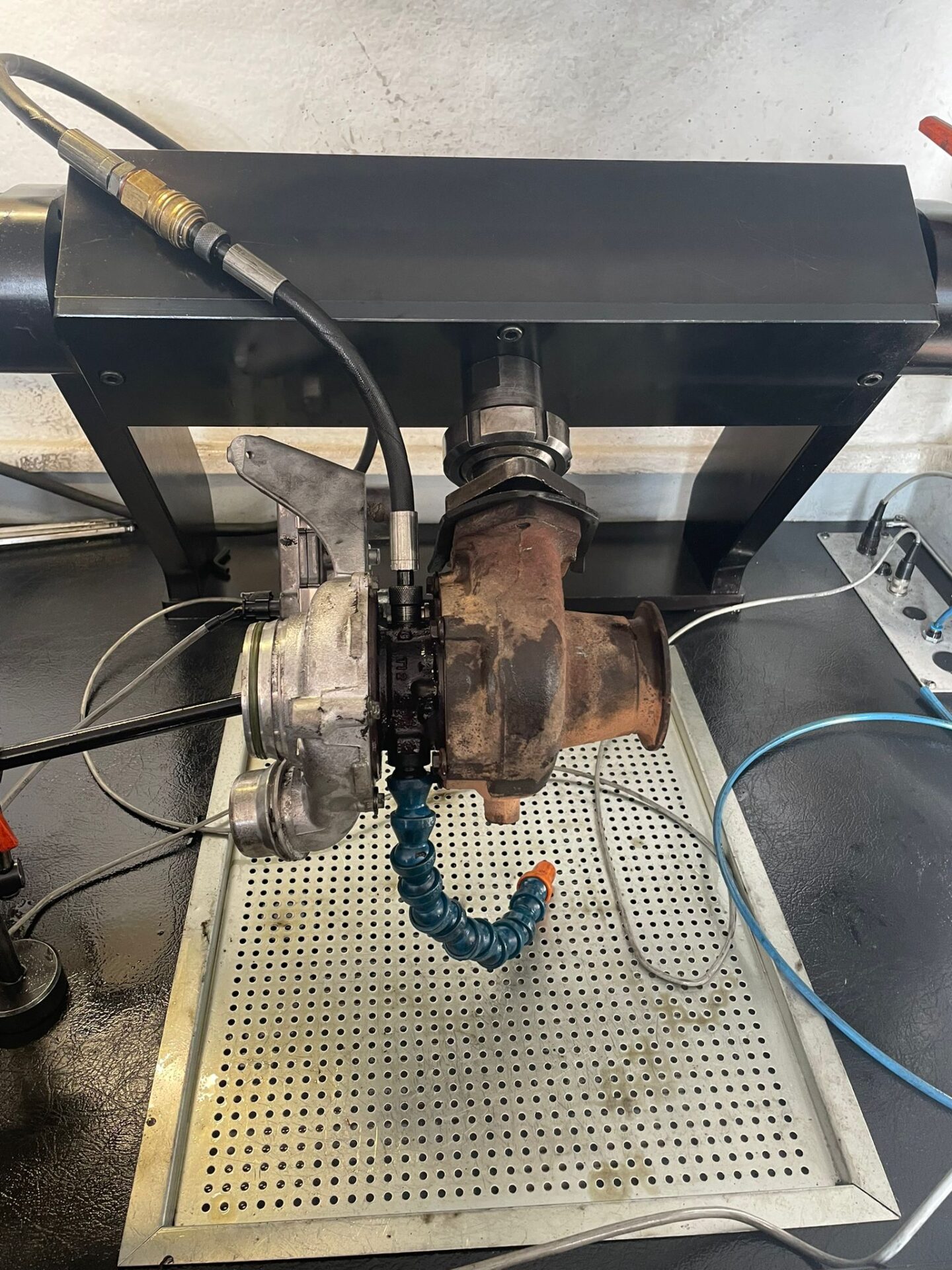 Din imaginile de mai sus, se poate observa uzura accentuata la fiecare componenta a acestei turbine. Astfel, o reconditionare completa a fost efectuata. Ce inseamna acest lucru? Toate componentele turbosuflantei (ax, corp, compresor, kit de reparatii) au fost piesele uzate inlocuite. Reconditionarea turbinei continua prin asamblarea unui nou miez. Acest miez a fost pozitionat pe bancul tester pentru echilibrarea finala. Graficul testului a aratat ca parametrii testului sunt intre 0 si 1, iar astfel echilibrarea a fost efectuata.
