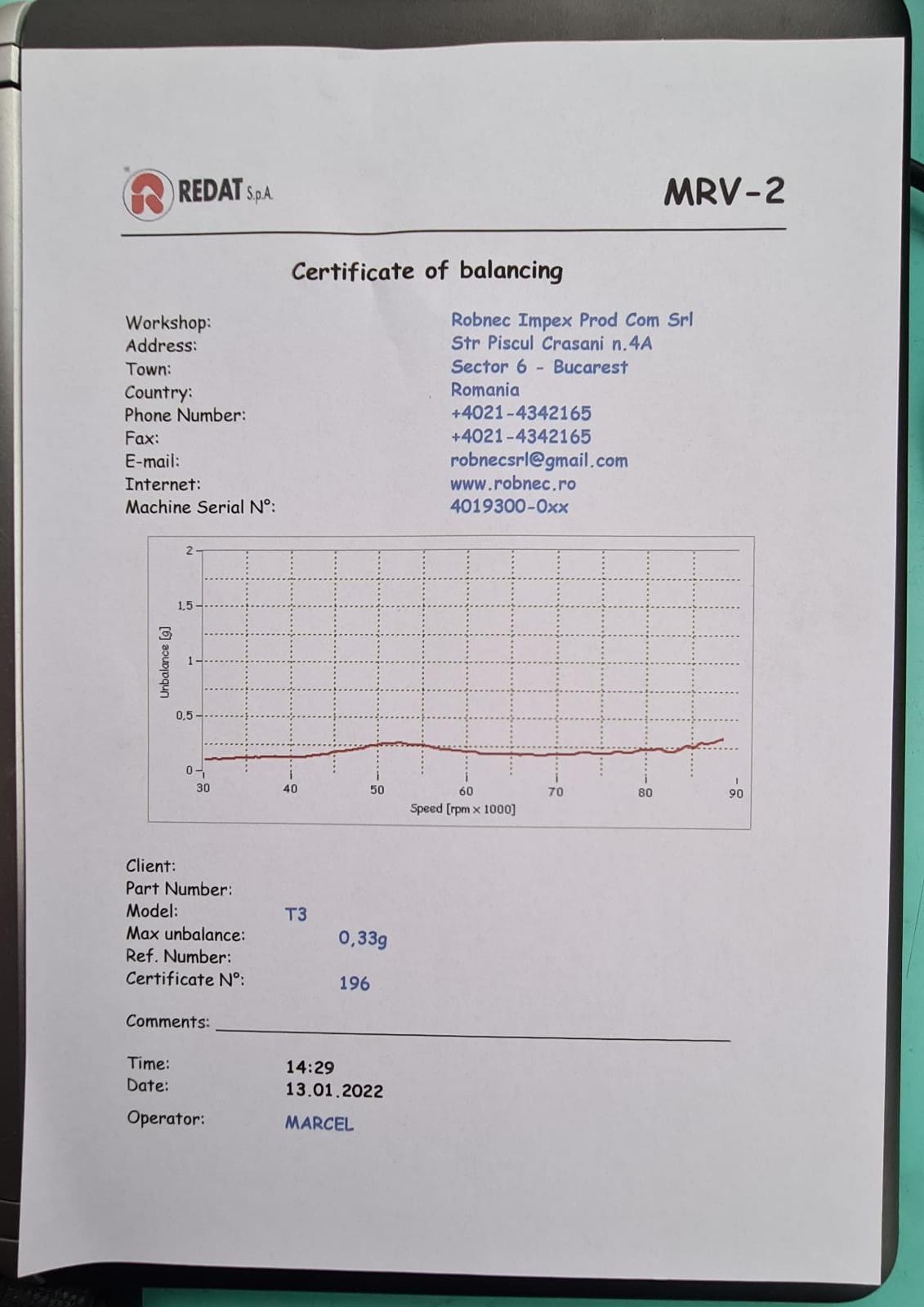 Dupa ce au fost inlocuite piesele uzate, turbina a fost pusa pe bancul de echilibrare si reglare a geometriei variabile. Se pot vedea in poza de mai jos, rezultatele testelor. In imaginea de mai sus, se pot vedea piesele ce au fost inlocuite in urma uzurii pronuntate care s-a constatat in interiorul turbinei. Acestea au fost introduse, iar turbina a fost dusa la bancul de echilibrare. Acest proces de echilibrare este crucial pentru reconditionarea turbinei pentru a verifica daca turbosuflanta functioneaza la rotatii inalte.