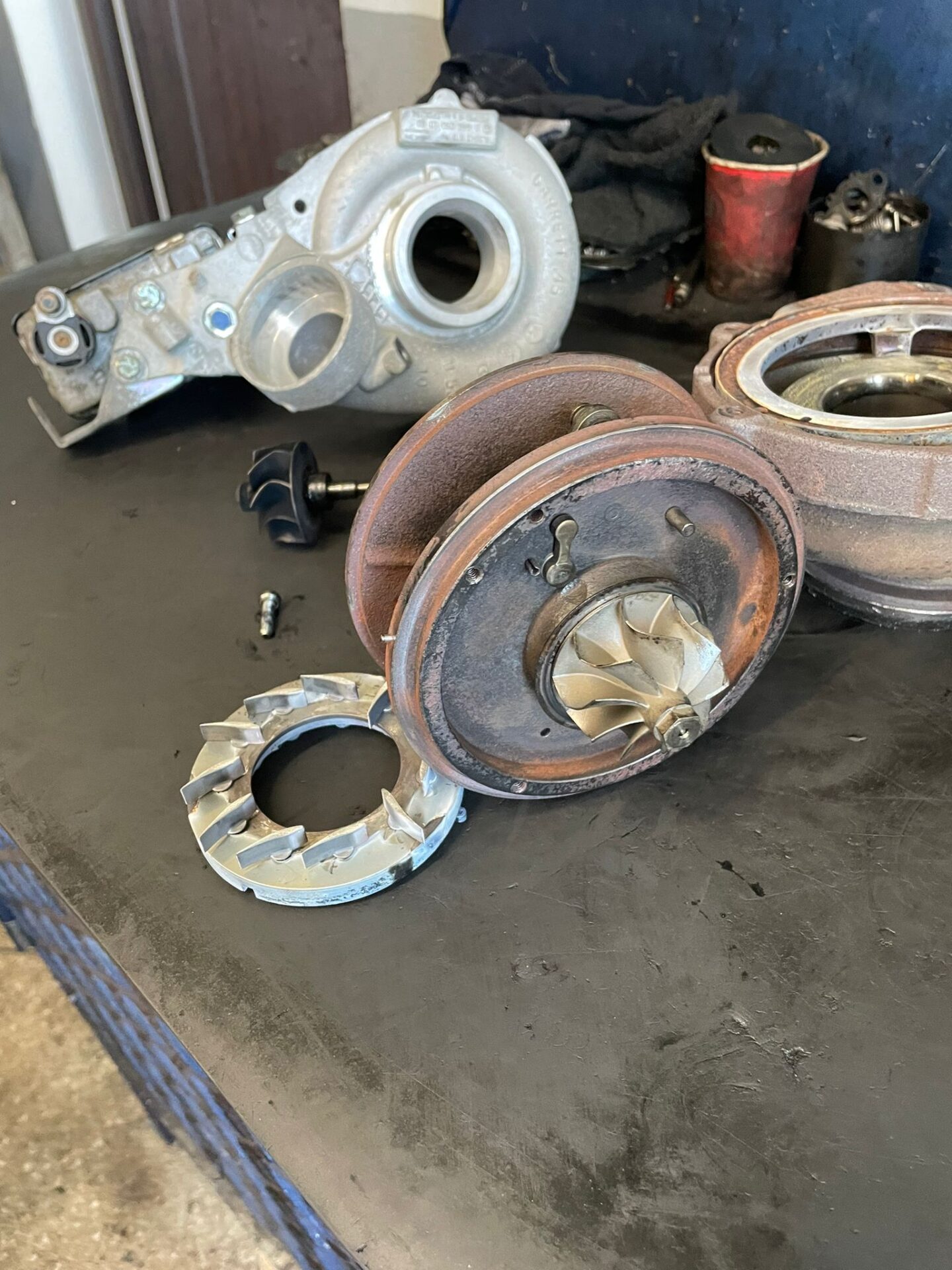 Dupa ce turbosuflanta a fost desfacuta, s-a putut spune cu exactitate cauza aparitiei avariilor la nivelul acesteia. Se poate vedea stratul accentuat de ulei la nivelul segmentilor, port-segmentilor, dar si reziduurile galbene de pe ax. Pentru ca turbina sa functioneze pe termen lung, este necesar ca schimbul uleiului sa fie efectuat la 10.000-15.000 de kilometri. Totodata, calitatea uleiului este un alt factor esential ce duce la uzura accentuata a turbosuflantei. Pentru ca reconditionarea turbinei sa fie efectuata, piesele uzate au fost inlocuite cu piese noi originale. Din poza de mai sus, se poate vedea ca axul, compresorul, kit-ul de reparatii, dar si corpul trebuie inlocuite. Kit-ul de reparatii consta in bucsi, segmenti, port-segmenti, dar si admisie. Dupa ce au fost inlocuite, miezul a fost asamblat. Acesta poate fi vazut in imaginea de mai jos.