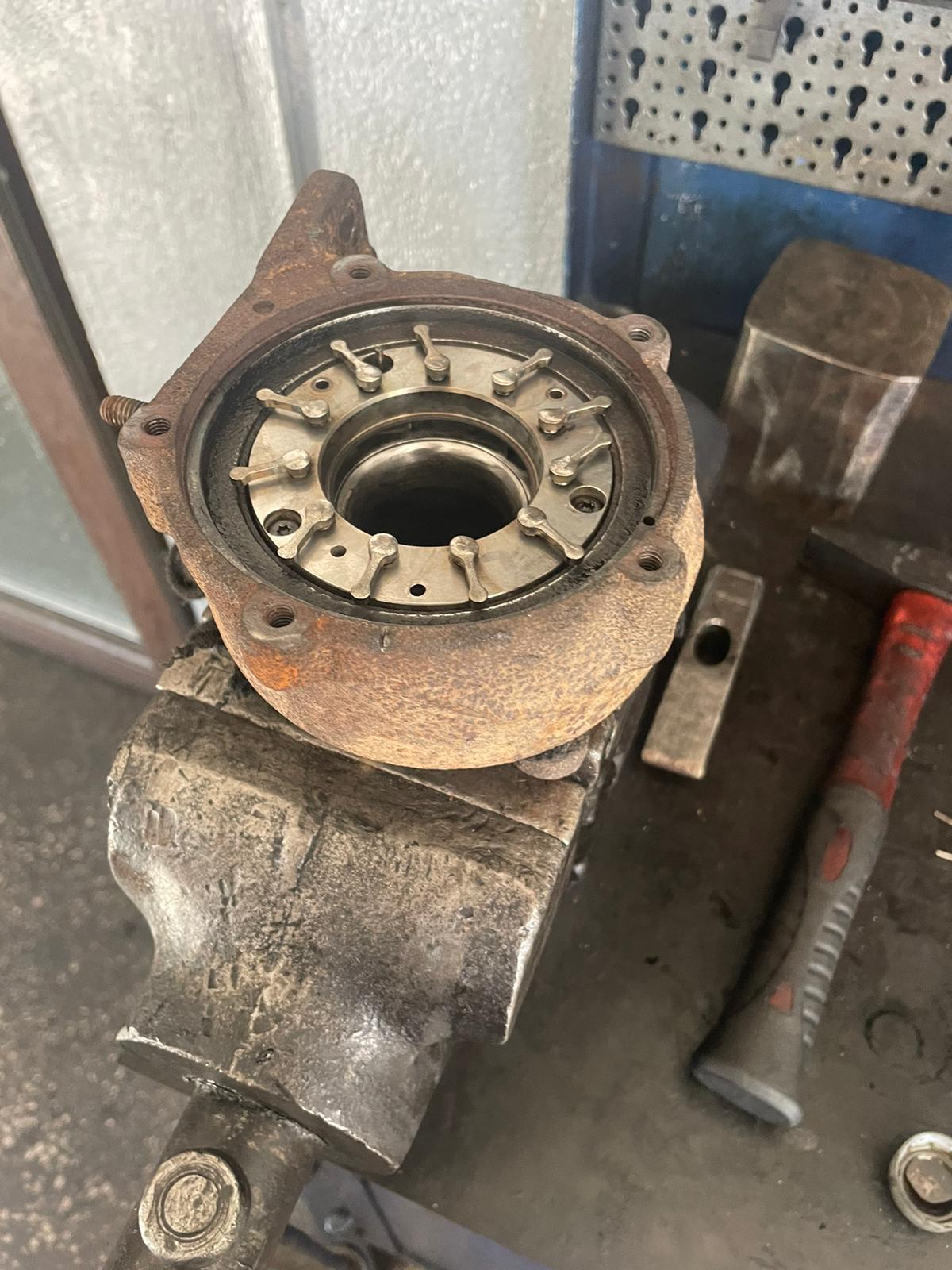 Pentru a putea realiza reconditionarea turbinei, prima etapa consta in verificarea jocului axial. Chiar daca acesta nu este vizibil, nu este exclus ca asta sa fie plin de ulei sau ruginit. In imaginea de mai jos, se poate vedea turbosuflanta descompusa pe bucati.
