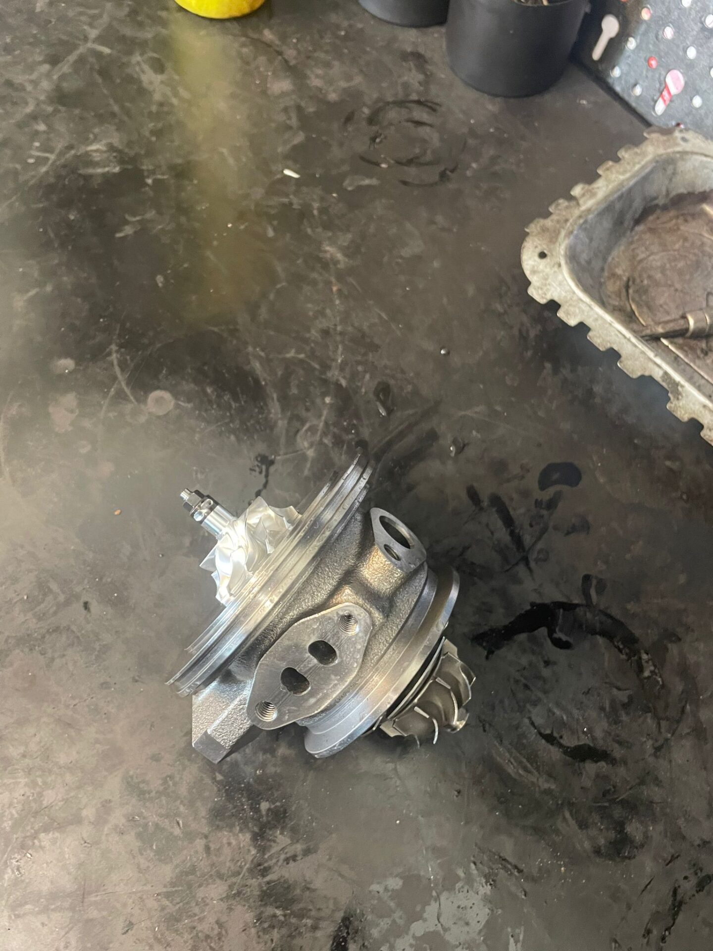 Pentru a face reconditionarea turbinei, actuatorul electric trebuie echilibrat pe tester. Din poza de mai sus, se poate vedea turbosuflanta dezasamblata pe bucati. Aceasta turbina are avarii accentuate, iar acestea pot fi vazute incepand de la ax, pana la compresor. Pentru a putea face echilibrarea, piesele avariate trebuie inlocuite cu piese noi, originale. Aceasta operatiune este o operatiune standard in atelierul Robnec. Astfel, axul, compresorul, kit-ul si corpul au fost inlocuite. Kit-ul este esential pentru ca reconditionarea sa fie efectuata. In pozele de mai jos, miezul asamblat poate fi vizualizat.